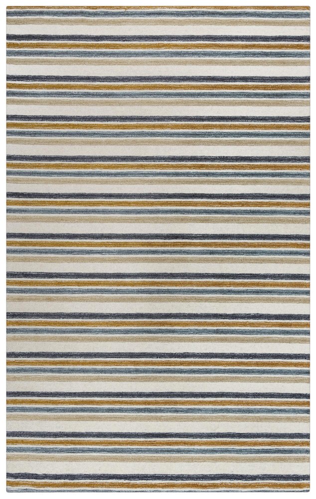 The Tetra area rug features a grey, beige, rust and white striped pattern and is crafted from tufted wool, providing a soft, plush feel.