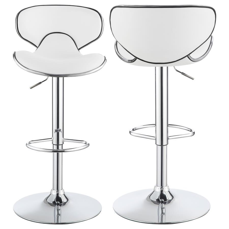 The Edenton Adjustable Barstool showcases a sleek design with white faux leather upholstery on both the seat and backrest. It is supported by a single steel leg, complemented by a round base and integrated footrest for added comfort and stability.
