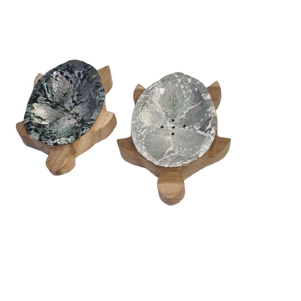 Teak turtle soap dish features a Mother of Pearl resin finish, available in two different colors.