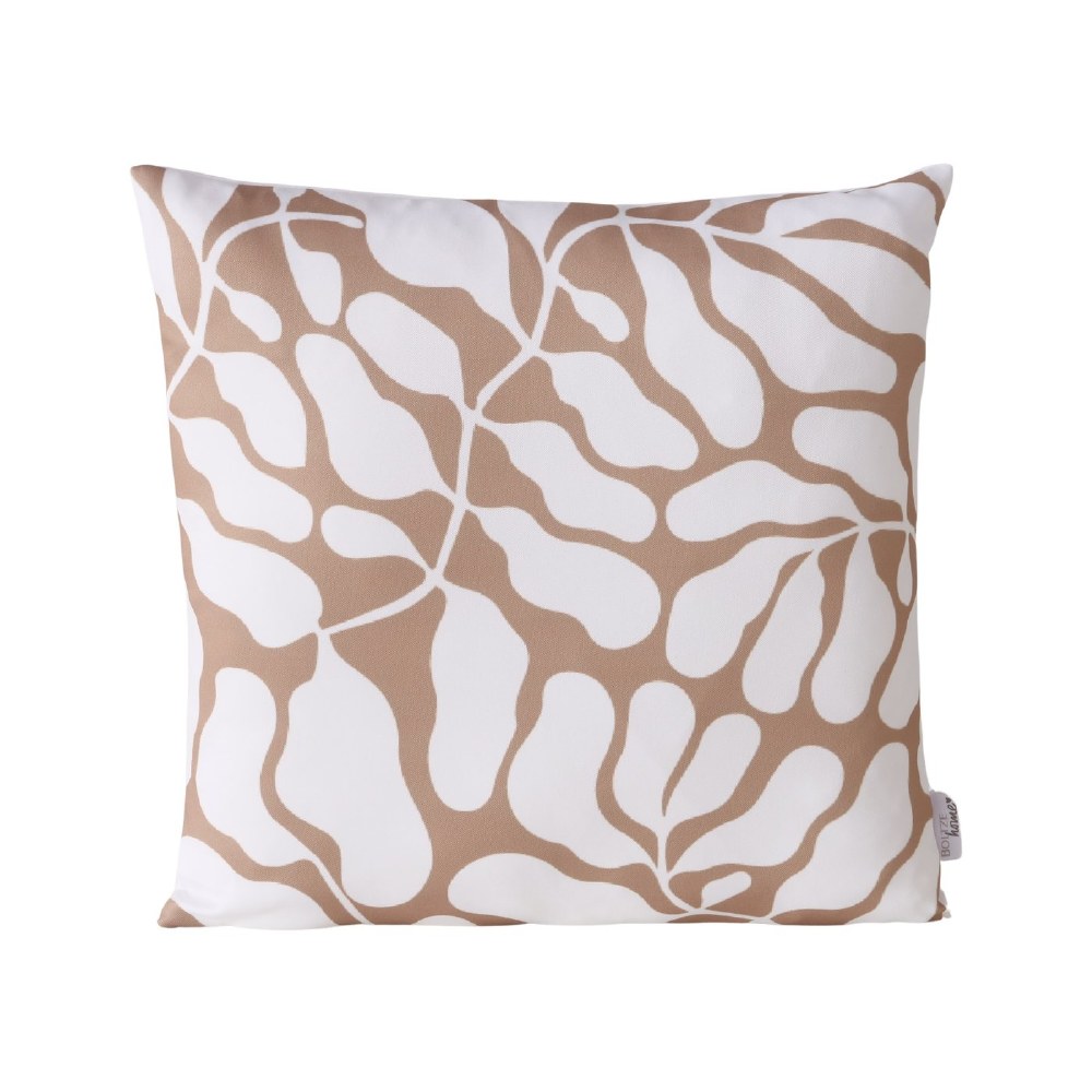 Tysko leaf cushion features a white silhoutte of vines and leave on a beige background.