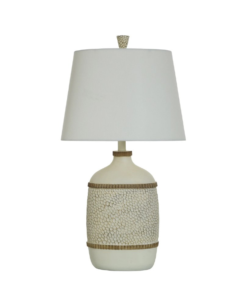 The Lindau Table Lamp showcases a sculptural resin body in an elegant ivory finish, highlighted by a textured band that adds depth and visual interest. Ribbed detailing frames both the central section and neck, lending a refined, artisanal character. The design is completed with a classic white oval shade.