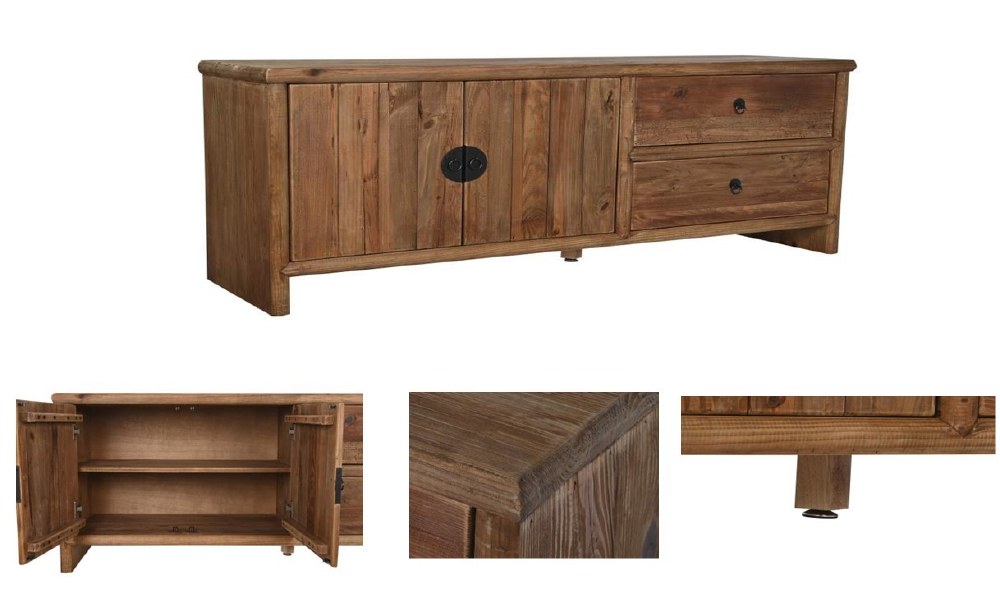 Japanese-style TV cabinet featuring two doors and two drawers, crafted from solid wood with a simple rustic design. Finished in a warm brown tone and complemented by durable metal hardware, this sideboard combines traditional charm with sturdy construction.