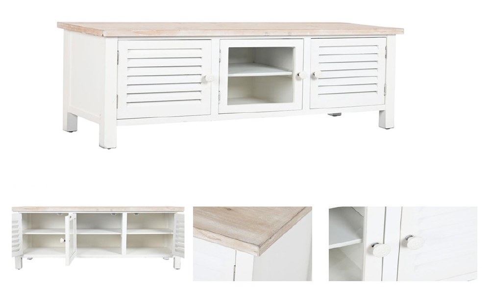 The Spruce White TV Cabinet features a sleek, contemporary design with two slatted and one glass door, each accented by simple round knobs. Inside, two shelves provide ample storage, divided into three organized sections. The cabinet showcases a natural wood finish on the top, complemented by a white finish on the body for a clean, modern contrast.