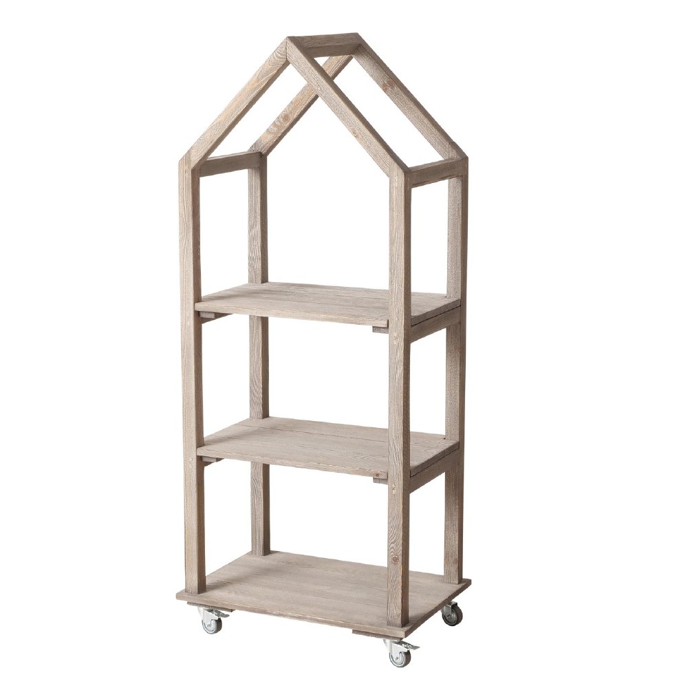 The Mensola shelf unit is a freestanding, house-shaped bookshelf designed to combine functionality with visual appeal. Crafted from high-quality pine wood with a natural finish, it features a distinctive house-shaped silhouette with three fixed shelves. The unit is mounted on caster wheels, allowing for easy mobility and flexible placement.