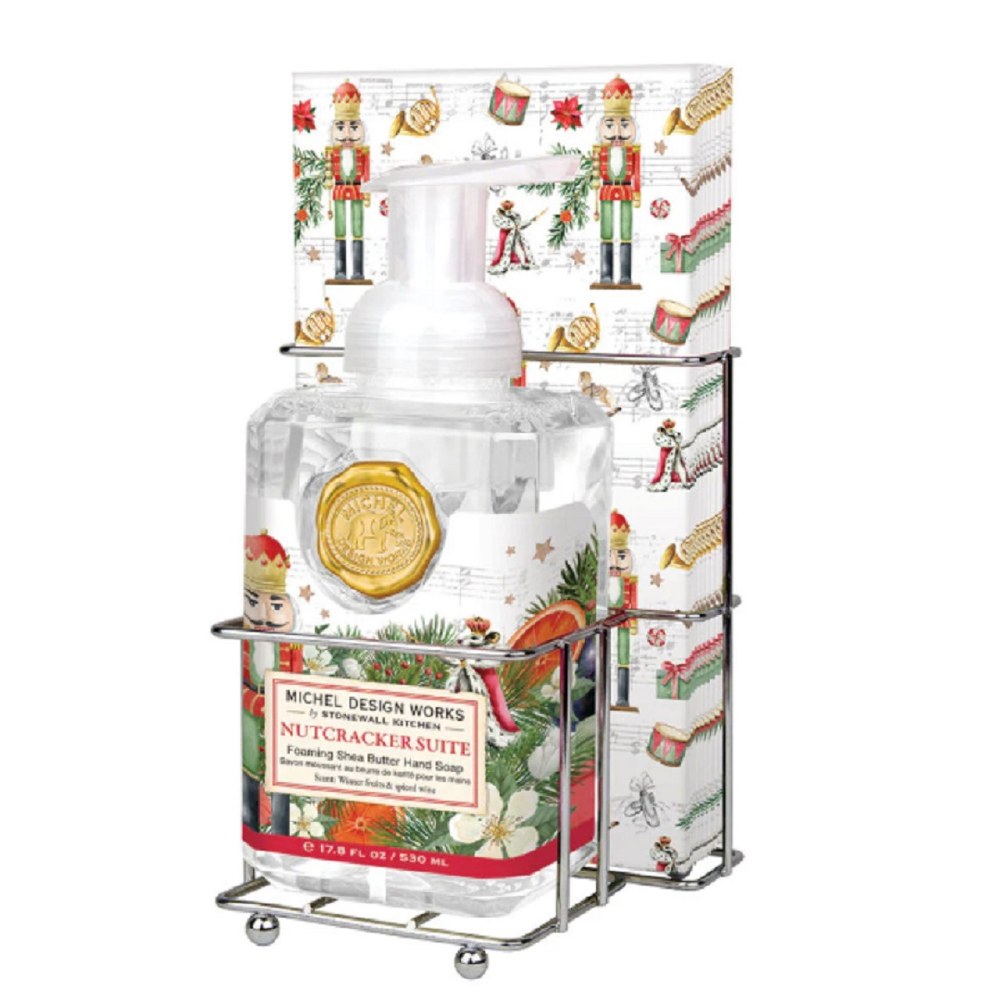 Nutcracker Suite Foaming Soap and Napkin Set. This beautifully coordinated collection includes a foaming hand soap, a set of decorative napkins, and a stylish caddy, all featuring a classic Nutcracker Suite design