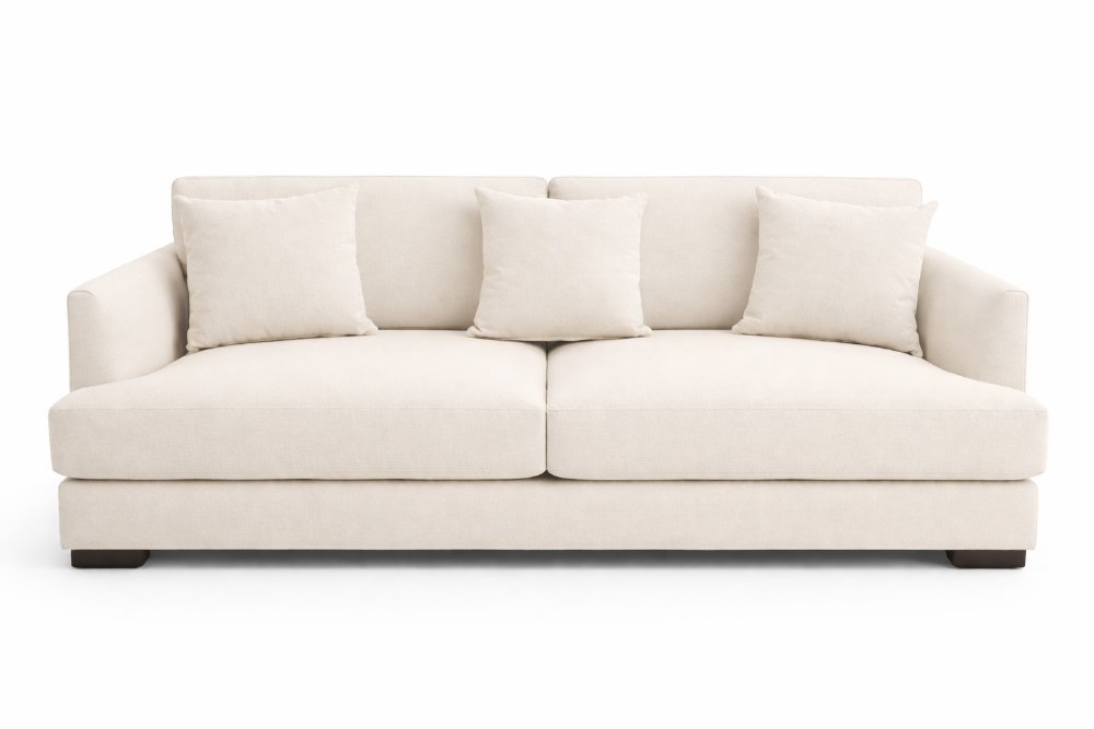 The Natur sofa is upholstered in a soft linen-blend fabric, offering a relaxed texture and lasting durability. Designed with clean lines, wide track arms, and deep, cushioned seating, it includes three matching throw pillows for added comfort and visual balance.