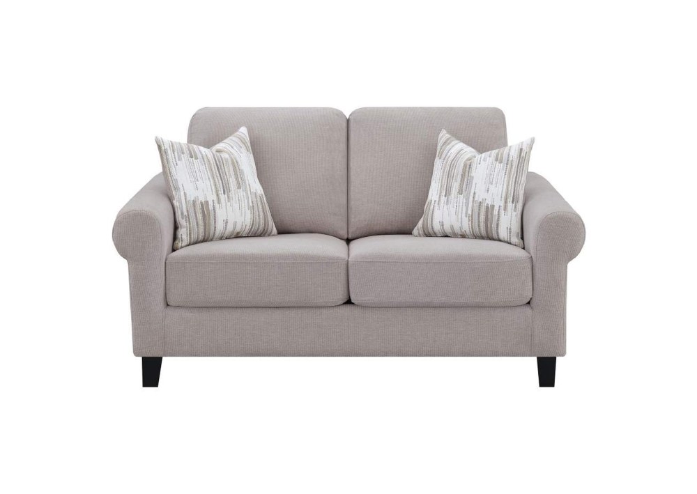 Oatmeal coloured chenille upholstered loveseat with rolled arms and black tapered legs. Plushed boxed seat and back cushions, detailed with top stitching and two throw cushions that coordinates perfectly with sofa.
