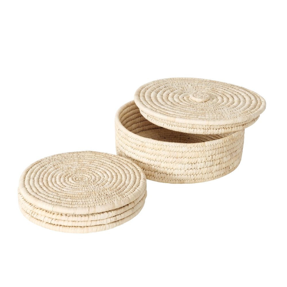 The set features four round, natural woven placemats accompanied by a matching storage basket for organized and convenient use.